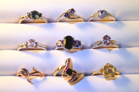 They include (from top left to right) Alexandrite, Bennitoite, Jeremajavite, Taaffaite, Serendinbite, Taaffaite Alexandrite CE, Painite, and Bixbite.